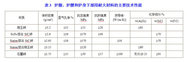 炉腰的炉身下部是高炉软熔带根部所在位置,这里温度高,但形不成渣皮或形不成稳定的渣皮“自我保护”。耐火材料经受剧烈的温度波动、初成渣的侵蚀、碱金属、锌的侵蚀、高温煤气流的冲刷、下降炉料的磨损、二氧化碳、水的氧化、一氧化碳的侵蚀等,要求耐火材料热震稳定性好、耐高温、抗碱性好、抗胡渣侵蚀能力强、抗氧化、耐磨、导热性号。曾用于该部位耐火材料有高铝砖、刚玉砖、铝碳砖、SiC砖、Si3N4结合SiC砖、Sialon结合SiS砖、热压石墨碳砖、半石墨碳-碳化硅砖、Sialon结合刚玉砖等。迄今为止,还没有找到一种完全能够满足这个部位工作条件的耐火材料。目前这个部位所以能持续工作十年以上,主要是靠控制边沿气流和强化冷却。相对来说,铝碳砖、SiC砖、Si3N4结合SiC砖、Sialon结合SiS砖、Sialon结合刚玉砖等有较好的使用效果。如果能保证足够强的冷却系统配置,采用石墨砖也是应用趋势。炉腹、炉腰和炉身下部用耐火材料的主要技术性能见表3.