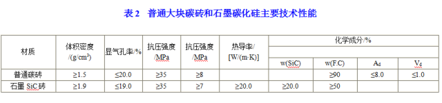 国外新建及新近大修的大型高炉炉底、炉缸结构形式主要有以下几种:在炉底炭块上砌陶瓷垫材料,炉缸采用热压小块碳砖;典型的陶瓷杯结构,炉底碳砖上砌莫来石砖,炉缸侧壁砌筑刚玉质大型预制块或塞隆结合刚玉砖,炉缸砌筑良好碳砖或微孔碳砖;炉底、炉缸耐火材料主要采用大块碳砖,石墨碳化硅砖和大块碳砖的主要技术性能见表2.关键部位采用微孔或超微孔碳砖,炉底碳砖上砌1~2层陶瓷砖。