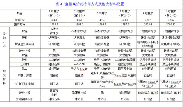 目前,宝钢运行的4座高炉中,1号和2号高炉均为大修后的第二代。每座高炉的建设或大修改造设计都曾对使用周期提出过不同的要求:1~3号高炉设计时分别提出了8、10、12年的一代炉龄寿命目标;到1号高炉大修时则提出12~15年;在4年高炉建设和2号高炉大修时又提高到18~20年。一代炉龄的单位炉容产量目标从目前的1.3×104t/m3提高到1.6×104t/m3以上,达到世界先进水平。为实现高炉一代炉龄寿命目标,宝钢采用了内衬耐火材料的不同设计配置,且适应于高炉的冷却方式。每座高炉的耐火材料和冷却方式配制见表4.